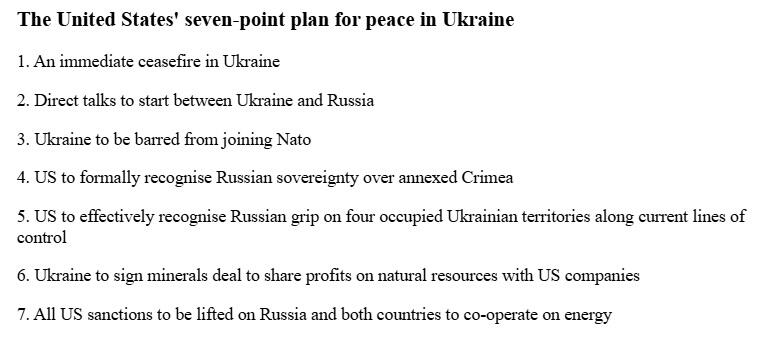 The minerals deal still has to be formally approved by Ukraine's parliament, according to the nation's constitution. Below is said to be the current seven-point plan offered by Trump, aspects of which were previously rejected by Ukrainian officials...