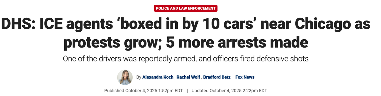 Kristi Noem, the Secretary of Homeland Security, wrote on X, "Today in Chicago, members of our brave law enforcement were attacked—rammed and boxed in by ten vehicles, including an attacker with a semi-automatic weapon. I am deploying more special operations to control the scene. Reinforcements are on their way. If you see a law enforcement officer today, thank them."