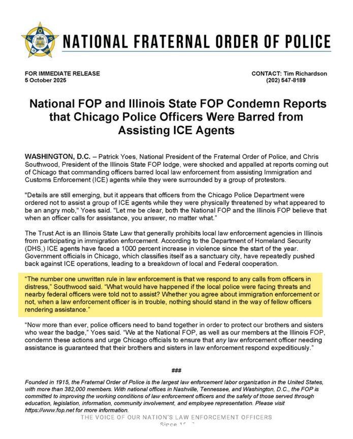 "Details are still emerging, but it appears that officers from the Chicago Police Department were ordered not to assist a group of ICE agents while they were physically threatened by what appeared to be an angry mob," Patrick Yoes, National President of the Fraternal Order of Police, wrote in a statement, adding, "Let me be clear, both the National FOP and the Illinois FOP believe that when an officer calls for assistance, you answer, no matter what."