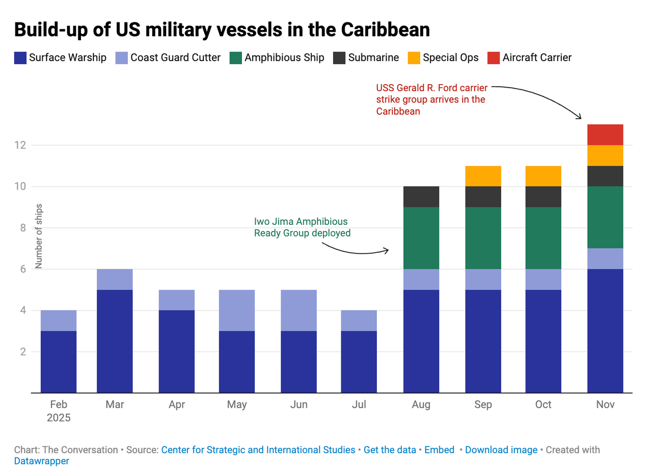 The Pentagon has been deploying warships and other military assets in the Caribbean this year. The deployment centers around bolstering Hemispheric Defense, and the Trump administration has formally characterized Nicolás Maduro as the head of a terrorist organization and considers his government illegitimate.