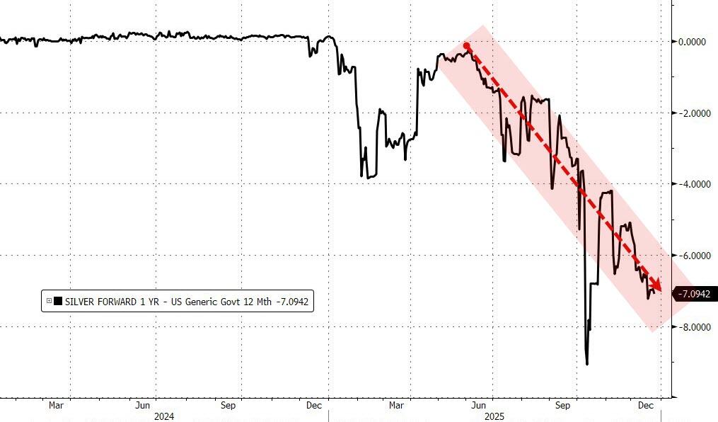 But that system is now under strain. Physical silver today is almost 7% more expensive than silver for delivery one year from now. Swaps were designed to avoid shipping metal around the world, yet today silver is being moved because buyers are demanding delivery.