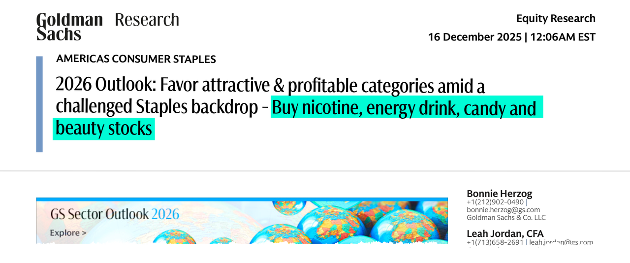 Bonnie Herzog, managing director and senior consumer analyst at Goldman Sachs, told clients Tuesday that, after consumer staples' underperformance in 2025, it is time to buy nicotine, energy drink, candy, and beauty stocks heading into 2026 as a stronger consumer backdrop emerges.