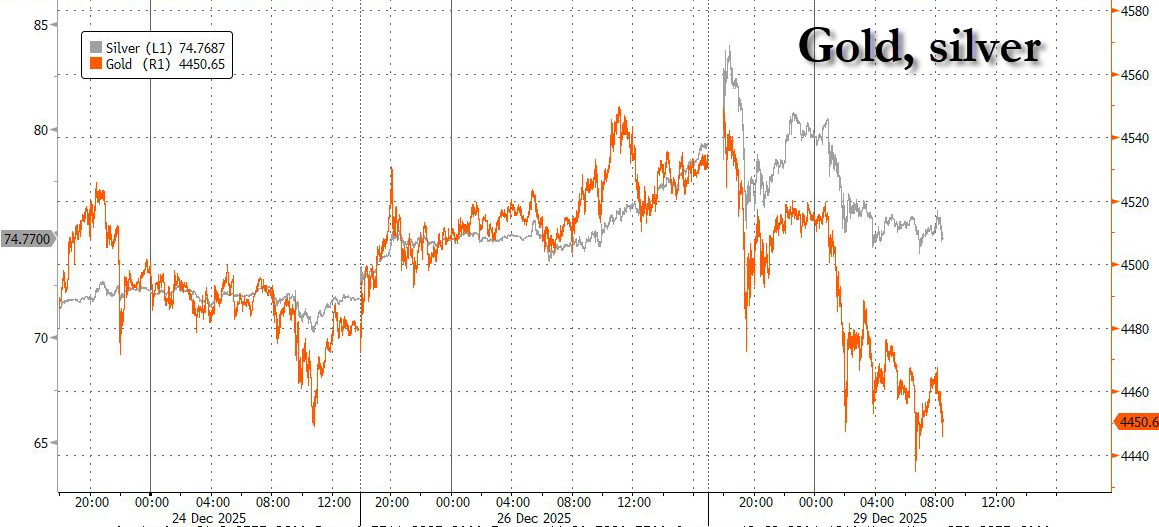 Stocks are extending their modest losses from their pre-Christmas record as another shortened trading week starts. As late last week, much of the market action is in precious metals, with silver first smashing through $80 for the first time before sliding while gold also retreated from Friday’s all-time high and platinum pulling back sharply after surging nearly 10%, and hitting limit down in China along with Platinum.As of 8:15am, S&P 500 futures were 0.3% lower while Nasdaq 100 contracts were down 0.4% as Tesla and Nvidia slid more than 1% to lead premarket losses among Mag 7. Europe’s Stoxx 600 was little changed following talks about a peace deal for Ukraine that yielded no breakthrough. Treasuries gained with 10Y yields down 0.2bps from Friday's close to 4.11% while the BBG dollar index rose. Bitcoin briefly surged back over $90,000 before getting summarily slammed right back down. Trading is likely to be light again, accompanied by a threadbare economic calendar and the absence of major planned corporate events.