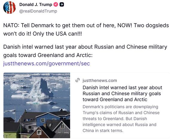 In follow-up on Wednesday, Trump issued a second Greenland Truth Social statement, this time highlighting that even Danish intelligence last year warned of the increased threat of Russian and Chinese military presence in the Arctic. The Europeans have suddenly been downplaying this, rejecting it as a rationale for a greater US military presence.